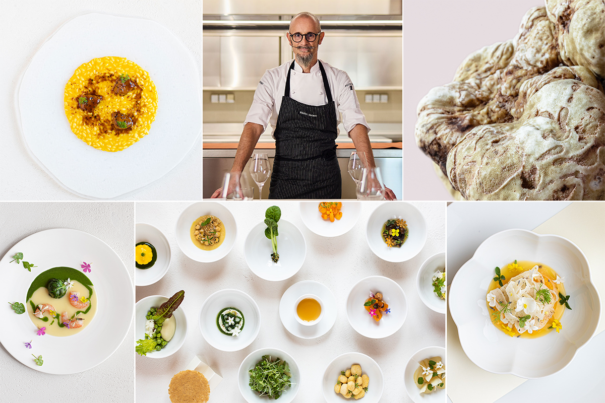 Crippa’s cooking reflects the Langhe landscape with botanical precision, drawing heavily from the restaurant’s biodynamic garden. For this special occasion we will enjoy a white truffle tasting menu, alongside the iconic Salad 21…31…41…51…, a breathtaking composition of herbs, leaves, and flowers.