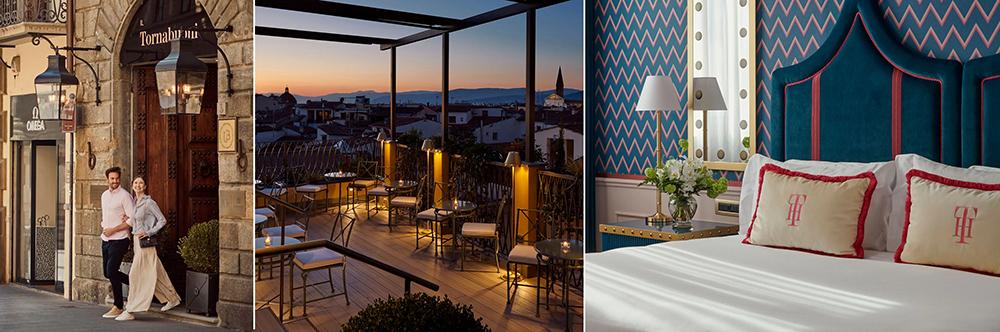 Located on one of Florence’s most elegant streets, Il Tornabuoni blends Renaissance history with contemporary luxury. The building dates back to the 12th century and has been beautifully restored with refined interiors, spacious rooms, and sweeping views across the city. Its rooftop terrace offers one of the most spectacular panoramas in Florence.